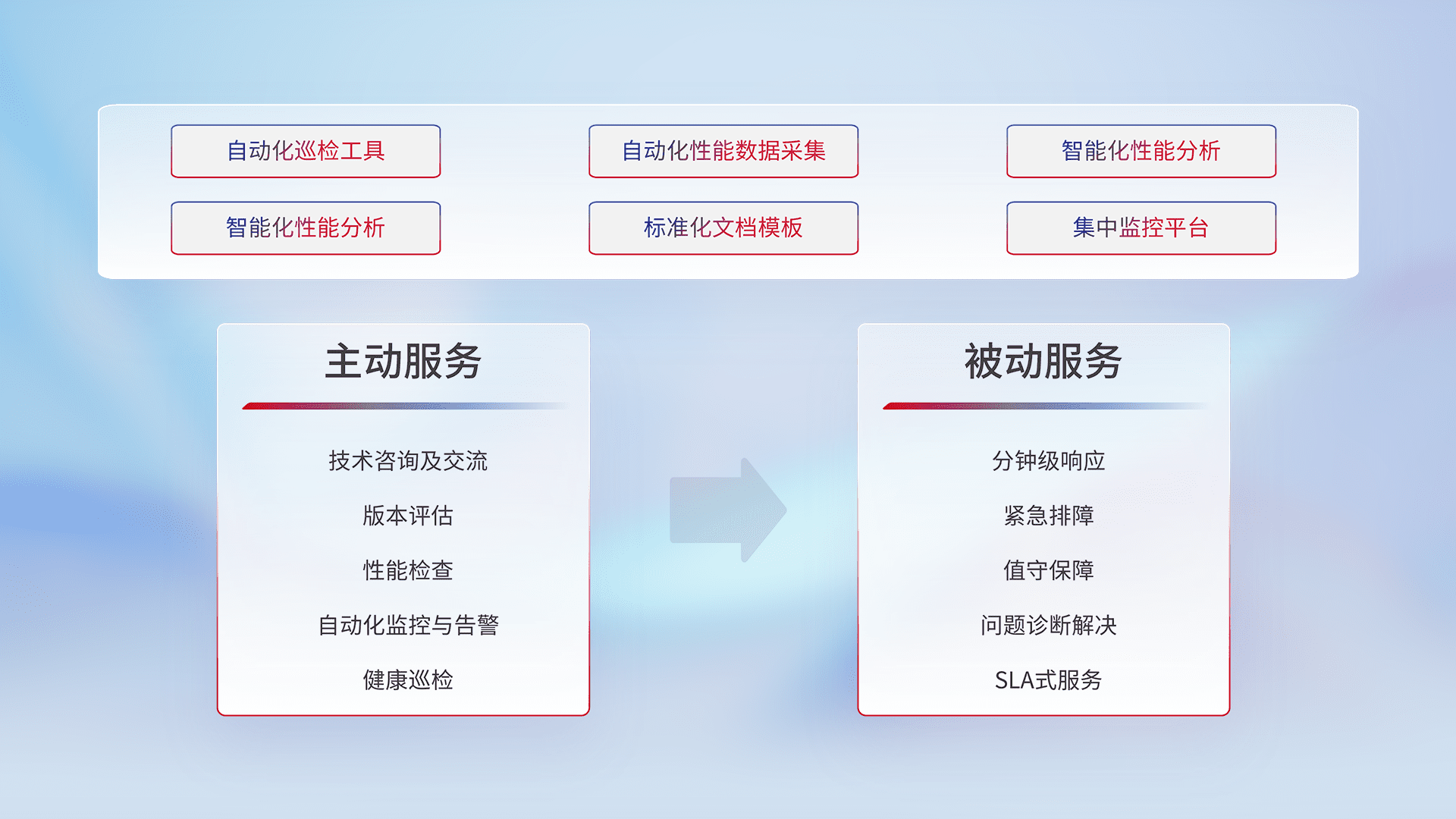 智能化工具和标准化文档,,,保障服务质量,,,提供主动服务(包含技术咨询、、、版本评估、、、、性能检查、、自动化监控与告警、、健康巡检)和被动服务包含(分钟级响应、、、、紧急排障、、、值守保障、、问题诊断解决、、、SLA服务)。。